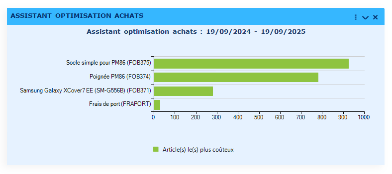 Avec le nouveau portlet d'optimisation "Assistant optimisation achat", vous visualisez les plus fortes dépenses probables à venir par article, afin de les anticiper et les négocier.