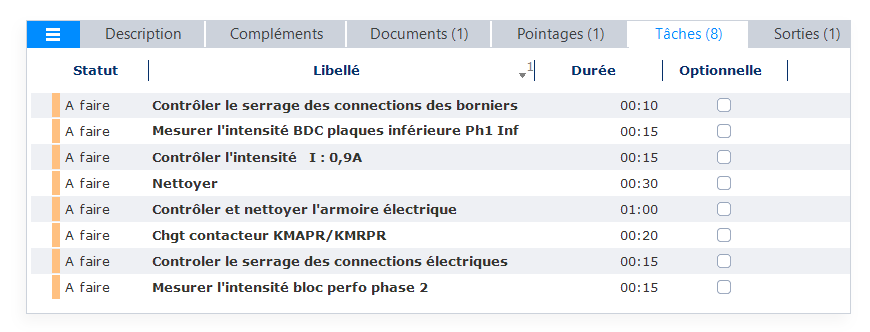 Retrouvez une nouvelle colonne, nommée "Optionnelle", sur les tâches de gammes et d'interventions. Elle permet d'indiquer les tâches optionnelles non imposées, dans le cadre de l'intervention.