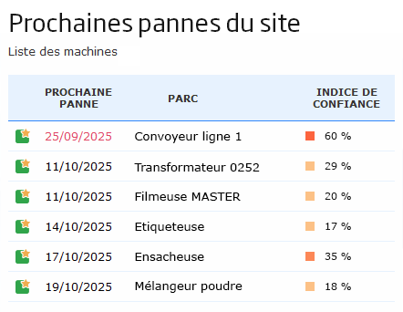 Un nouveau portlet de prévision des pannes, nommé "Prochaines pannes", est disponible en page d'accueil ou en page 360. Il vous informe de la date probable de la prochaine panne, équipement par équipement.