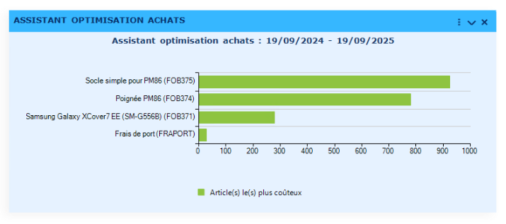 Avec le nouveau portlet d'optimisation "Assistant optimisation achat", vous visualisez les plus fortes dépenses probables à venir par article, afin de les anticiper et les négocier.