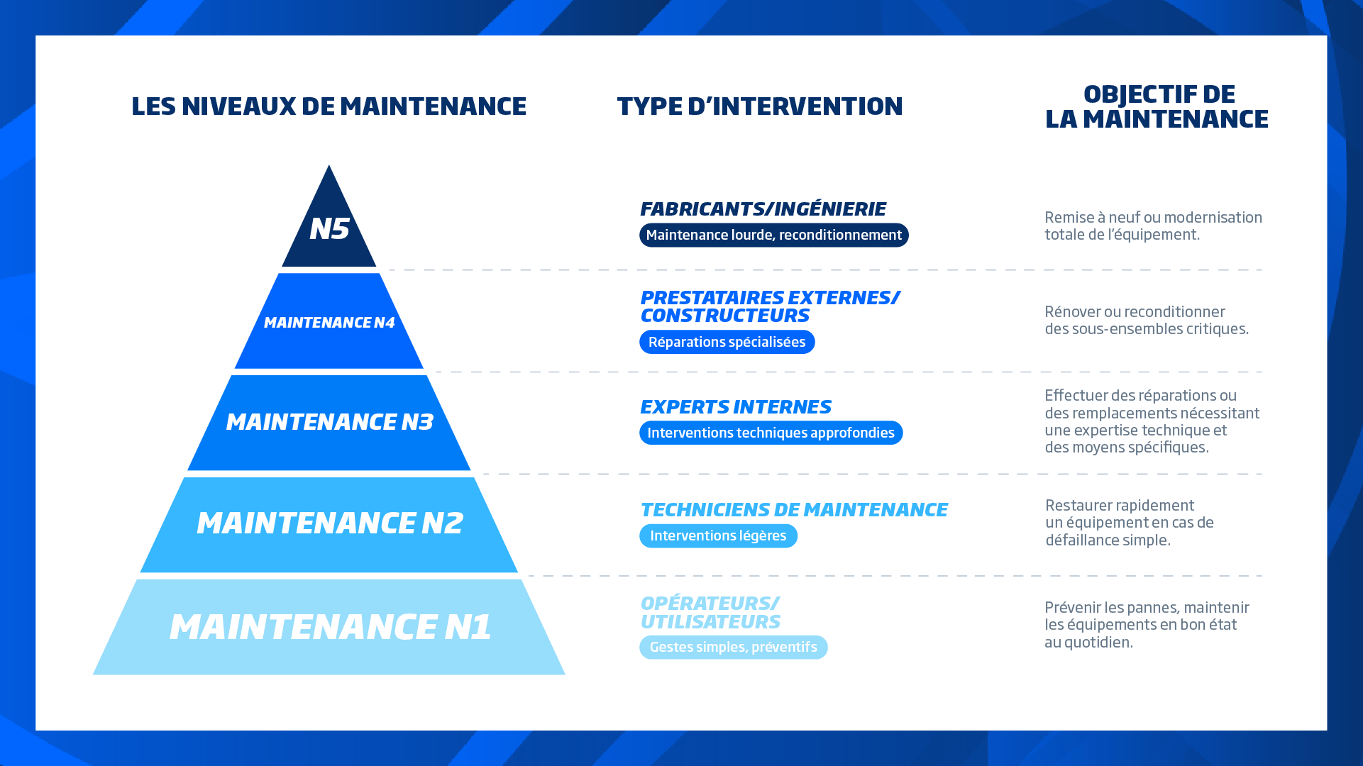 Avant d’aborder les enjeux spécifiques de la maintenance de premier niveau, il est essentiel de pouvoir la situer dans le cadre global de la maintenance industrielle. Rappelons brièvement la classification en cinq niveaux des différents types de maintenance industrielle, issue des normes AFNOR NF X60-000 et X60-010.